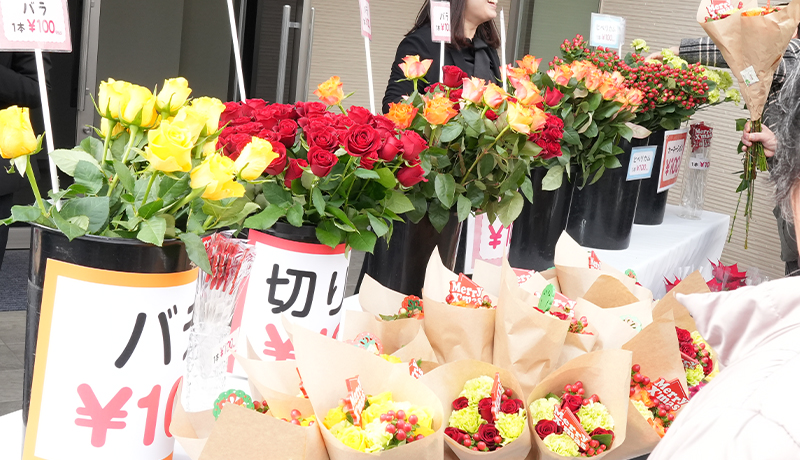 オープン記念として、花市を開催!バラ・カーネーションなどのお花を1本100円(税込)でご用意いたしました。